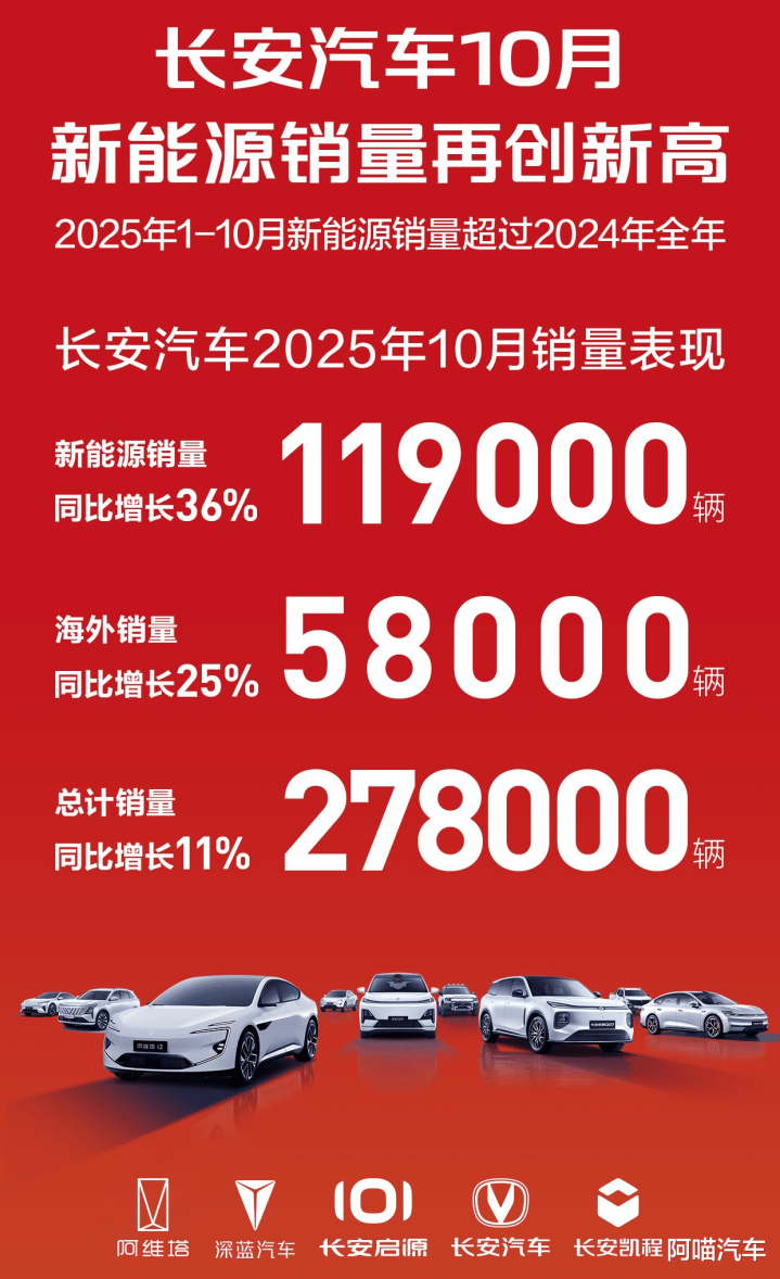 海外市场也成为长安汽车的重要增长点,10月海外销量达5.8万辆,同比增长25%。1-10月累计海外销量已超过31.8万辆。