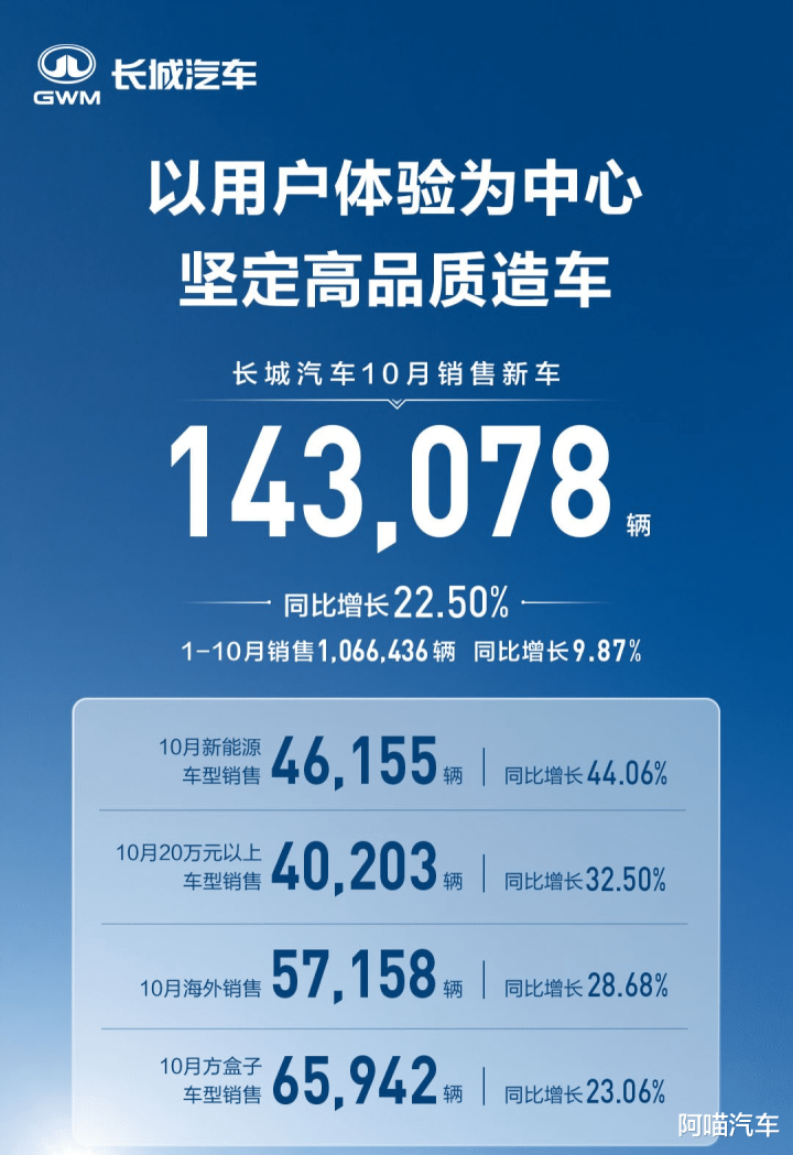 长城汽车10月销售新车143,078辆,创下公司历史上10月份的最佳销售成绩,同比增长22.5%。新能源车型销量达46,155辆,同比大幅增长44.06%,刷新了月销纪录。