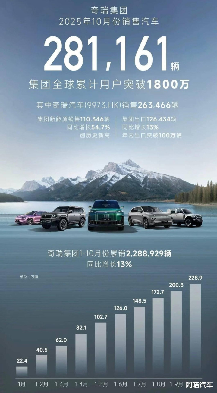 至于海外市场方面,奇瑞从很早之前就布局海外市场了,10月出口126,434辆,同比增长13%,连续六个月单月出口突破10万辆。1-10月累计出口已达1,062,862辆,以历史最快速度实现年内出口超百万辆。