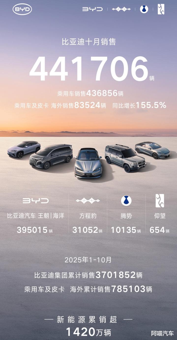 比亚迪2025年10月销售441,706辆,创下年内单月销量最佳成绩,但同比2024年10月下降12.13%,主要是高端市场进展不佳,而20万以内市场也被冲击。