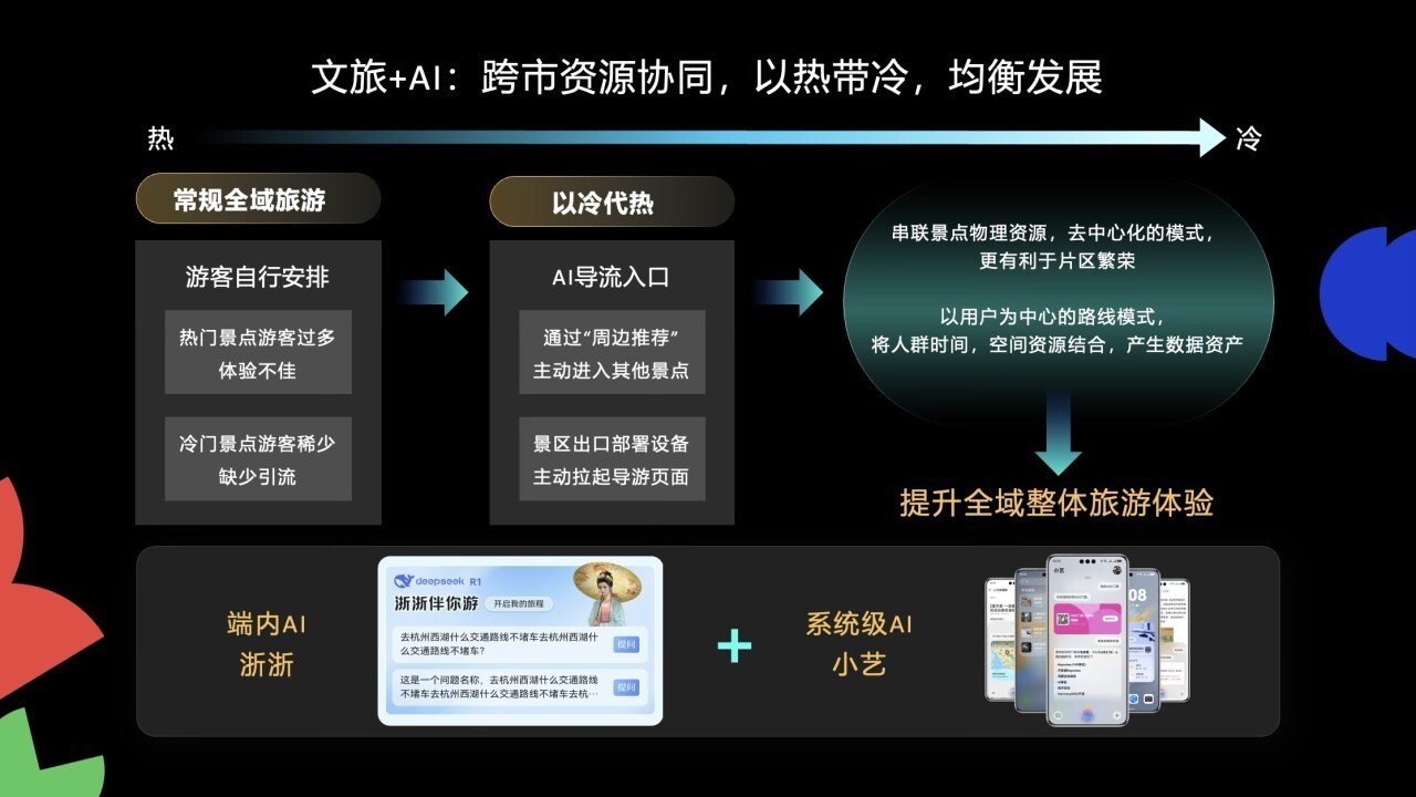 浙江文旅就在 HDC 2025 鸿蒙生态解决方案论坛上分享了以鸿蒙生态推动文旅数字化的全新探索。不同于传统意义上的数字文旅平台,由浙江省文化和旅游厅打造的「游浙里」,目标是聚焦游客出行所需,为用户提供深度玩法、预订预约、信息查询、智能化行程等全流程的一站式旅游服务平台。通过接入鸿蒙的意图框架以及元服务的能力,「游浙里」可以基于鸿蒙的近场发现能力实现全链路服务协同,比如借助小艺建议基于位置「服务找人」的特性,由远及近提供更主动的全旅程服务。同时,「游浙里」还将基于端内 AI 浙浙以及系统级 AI 小艺进行「AI 导流」,通过「周边推荐」结合冷热景点来合理配置旅游资源。