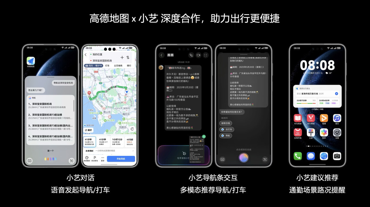 高德地图则展示了与小艺深度合作的「一句话导航/打车」,通过小艺确认导航或者打车意图,可以直接拉起高德地图进行服务。同时基于鸿蒙意图框架以及高德意图理解的结合,小艺建议根据通勤时间、个人位置、用户画像等进行路况提醒、场景推荐(如周边美食、周末游等),提高场景贴合度,让高德地图实现多场景下精准的服务推荐。未来,高德地图还将与小艺围绕导航出行、车主服务、生活服务、用户资产、运营活动五个垂类场景开展精细服务体验共建。