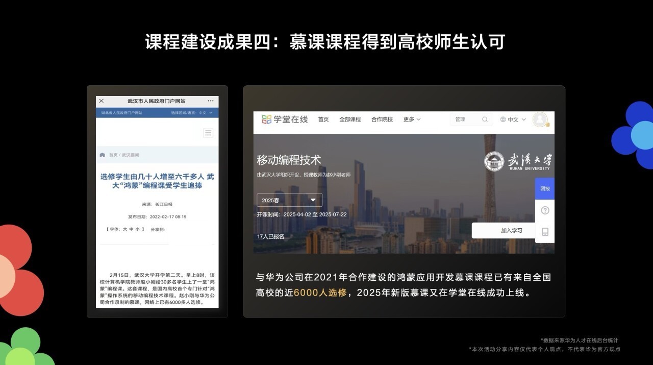 而武汉大学在 2021 年就与华为共建了全国首门鸿蒙应用开发慕课课程,是全国最早开设 HarmonyOS 课程的高校,与华为合作建设的鸿蒙应用开发慕课课程已有来自全国高校的近 6000 人选修。武汉大学计算机学院软件工程系副主任赵小刚也分享了围绕鸿蒙所做的课程共建实践,在学生实践能力得到提高的同时,也通过组织参加鸿蒙技术相关师资培训,影响教师 500 人左右。除了继续深化教学资源,武汉大学还通过实例化教学改变课堂的授课方式,实现了师资课程的共建共享。