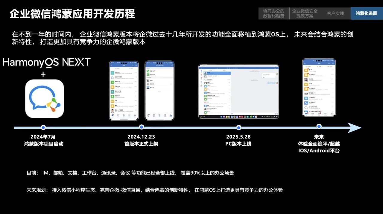 企业微信介绍了其鸿蒙版本的开发历程,从 2024 年 7 月项目启动至今,企业微信鸿蒙版已经完成了包括 IM、日程、会议、文档、工作台等核心办公能力的全面上线,覆盖了 90% 以上的办公场景。同时企业微信也透露,基于鸿蒙「一次开发,多端部署」的优势,企业微信鸿蒙版用一套代码实现了移动端、平板端以及电脑端等多端体验的统一,极大提高开发效率。