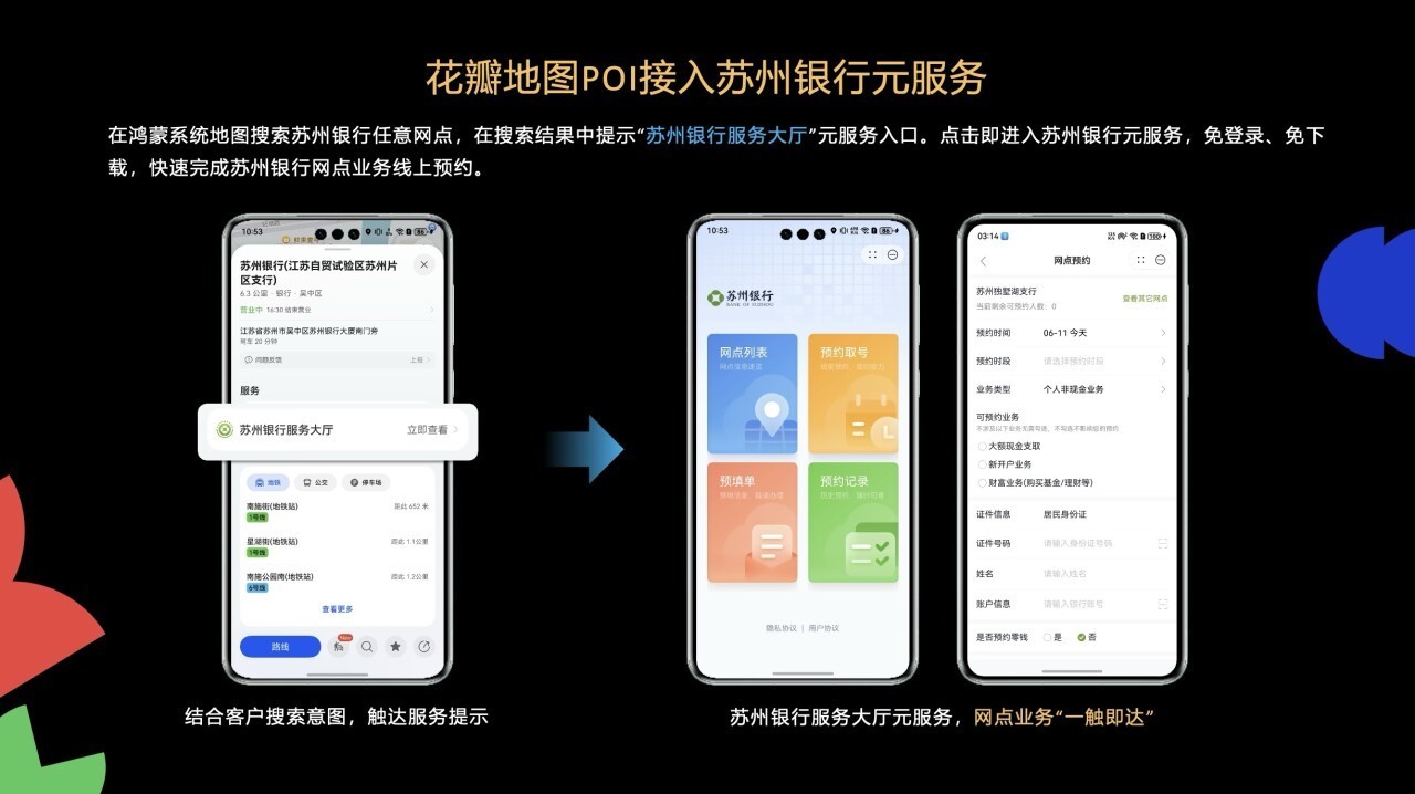 金融服务天然对安全性与合规性要求极高,苏州银行在鸿蒙生态行业解决方案论坛期间给出了很有参考价值的应用范式。据介绍,苏州银行在 2024 年 9 月就推出了苏州银行手机银行鸿蒙版,随后还推出了「苏州银行服务大厅」元服务,在鸿蒙系统地图搜索任意网点就能进入元服务,并且实现了免登录、免下载完成网点业务线上预约。