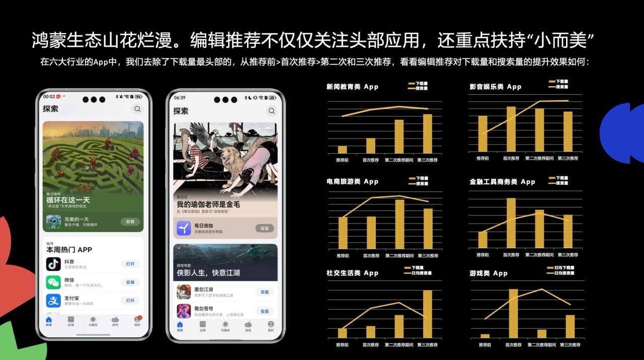 同时华为应用市场 AppGallery 不仅仅关注飞书等头部应用,通过「编辑推荐」等机制提升多端曝光,拓宽用户使用场景,帮助飞书进一步打造精品标杆应用,更为一批「小而美」的应用提供了可观的流量支持。在电商、教育、工具以及游戏类等六大行业中,不乏「小而美」的应用在被推荐后搜索量和下载量快速增长的案例。再结合完善的支付体系,鸿蒙可以帮助第三方应用快速实现商业闭环,据透露,部分头部鸿蒙应用的会员渗透率提高了 150%。