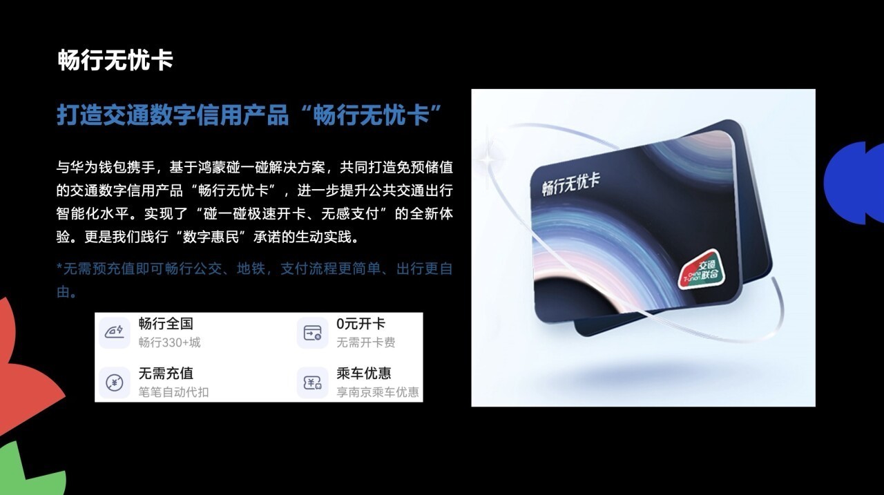此外,交通出行是用户的高频支付场景之一,也是鸿蒙的关键战场。江苏交通一卡通在 HDC 2025 的元服务和服务分发分论坛期间就展示了江苏交通一卡通与华为钱包,基于鸿蒙碰一碰解决方案共同打造的「畅行无忧卡」。畅行无忧卡的核心亮点是免储值,但背后的关键是实现了「碰一碰极速开卡、无感支付」的全新体验。用户只需一碰,即可启用该卡出行,摆脱了物理卡片购买和充值的冗余步骤,极大提升了用户体验。这不仅是一次产品升级,更是支付逻辑与出行方式的根本性转变。