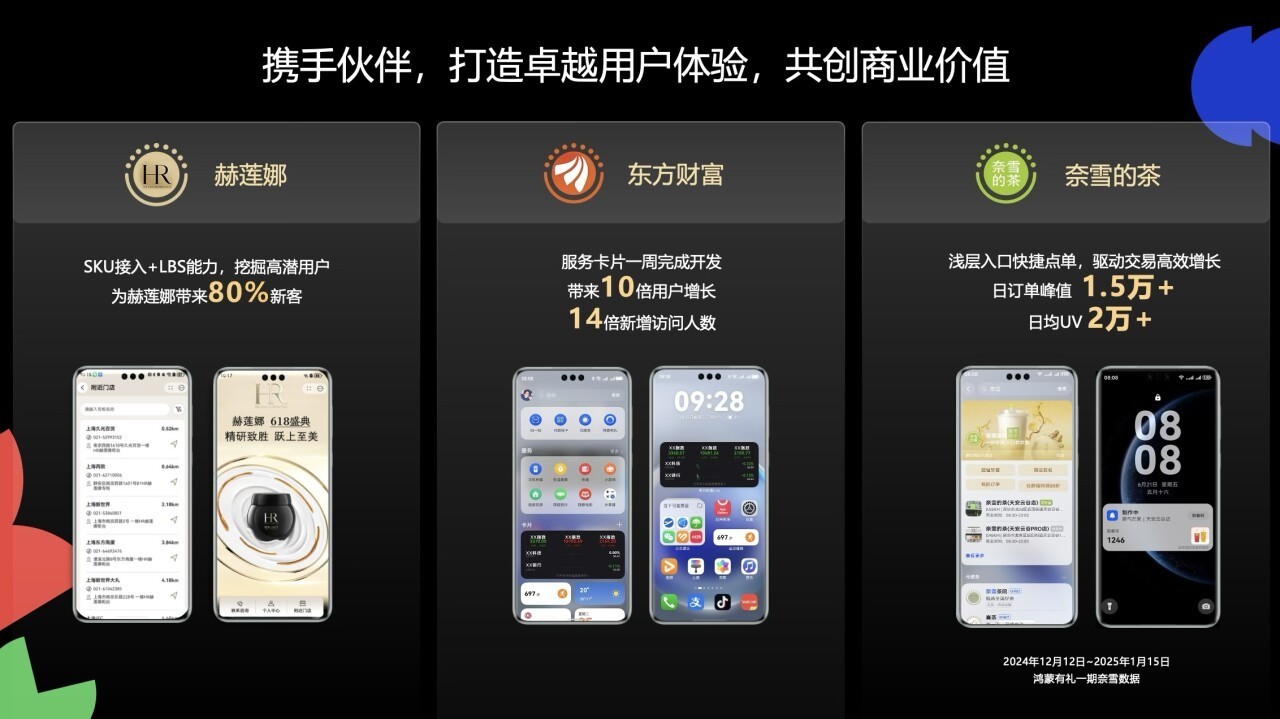 以东方财富为例,仅仅一周就完成了服务卡片的开发,但却带来了 10 倍的用户增长以及 14 倍的新增访问人数。此外,通过 SKU 接入+LBS 能力开发鸿蒙元服务,知名美妆品牌赫莲娜也在深入挖掘高潜力用户,并带来了 80% 的新客。