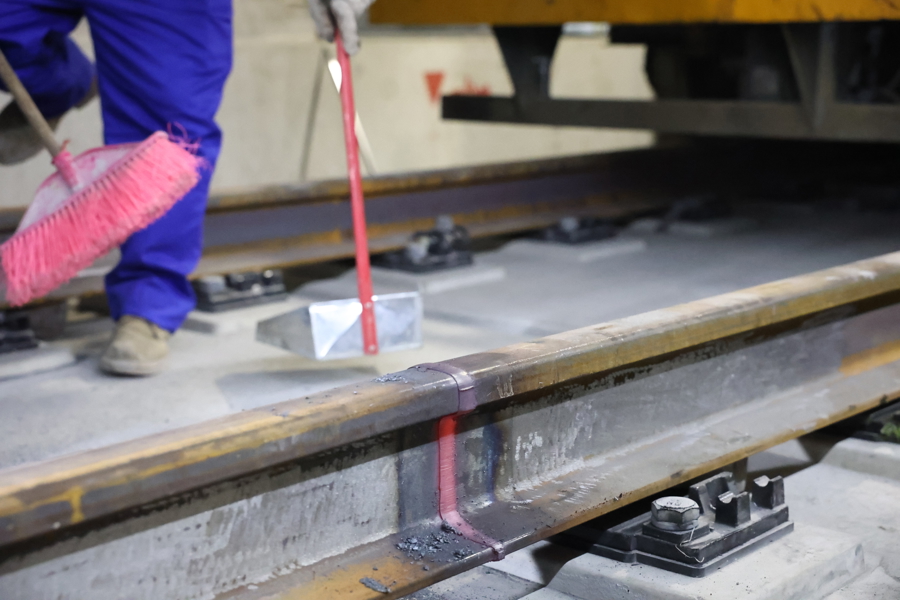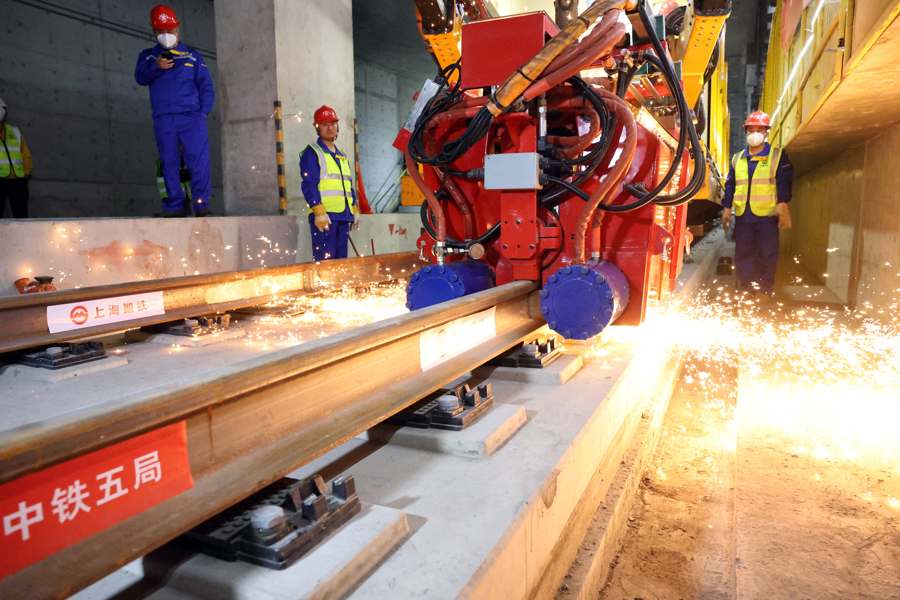 上海轨道交通22号线陈家镇车站内,中铁五局作业人员在进行最后一对钢轨接头焊接。
