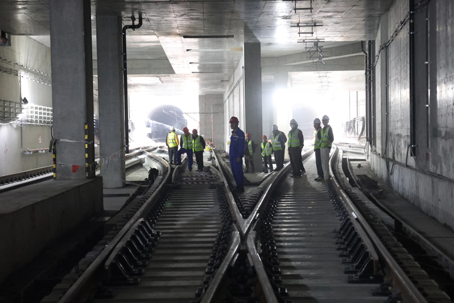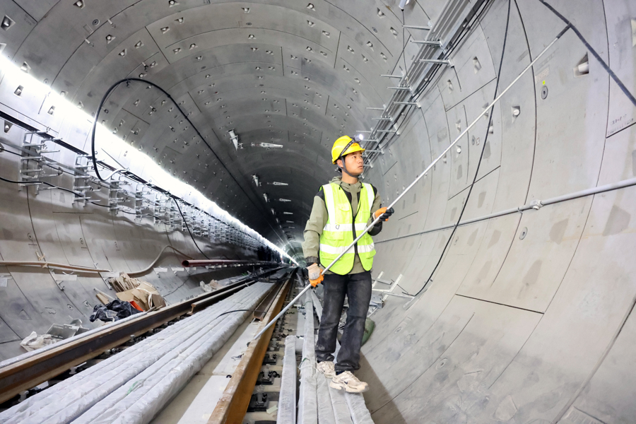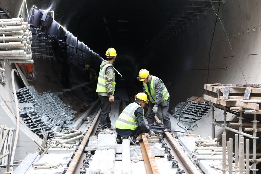 工作人员在铺设线缆。铺轨贯通为后续机电设备安装、系统联调联试及电客车上线调试奠定了基础。