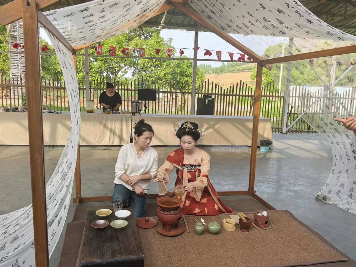 02第二站:陆子生态茶园——“一片叶”背后的文化味车子刚开进陆子生态茶园,漫山绿意扑面而来。更吸引人的,是一场唐代煎茶表演——茶艺师身着古装,碾茶、煮水、分汤,一招一式,古韵悠长。